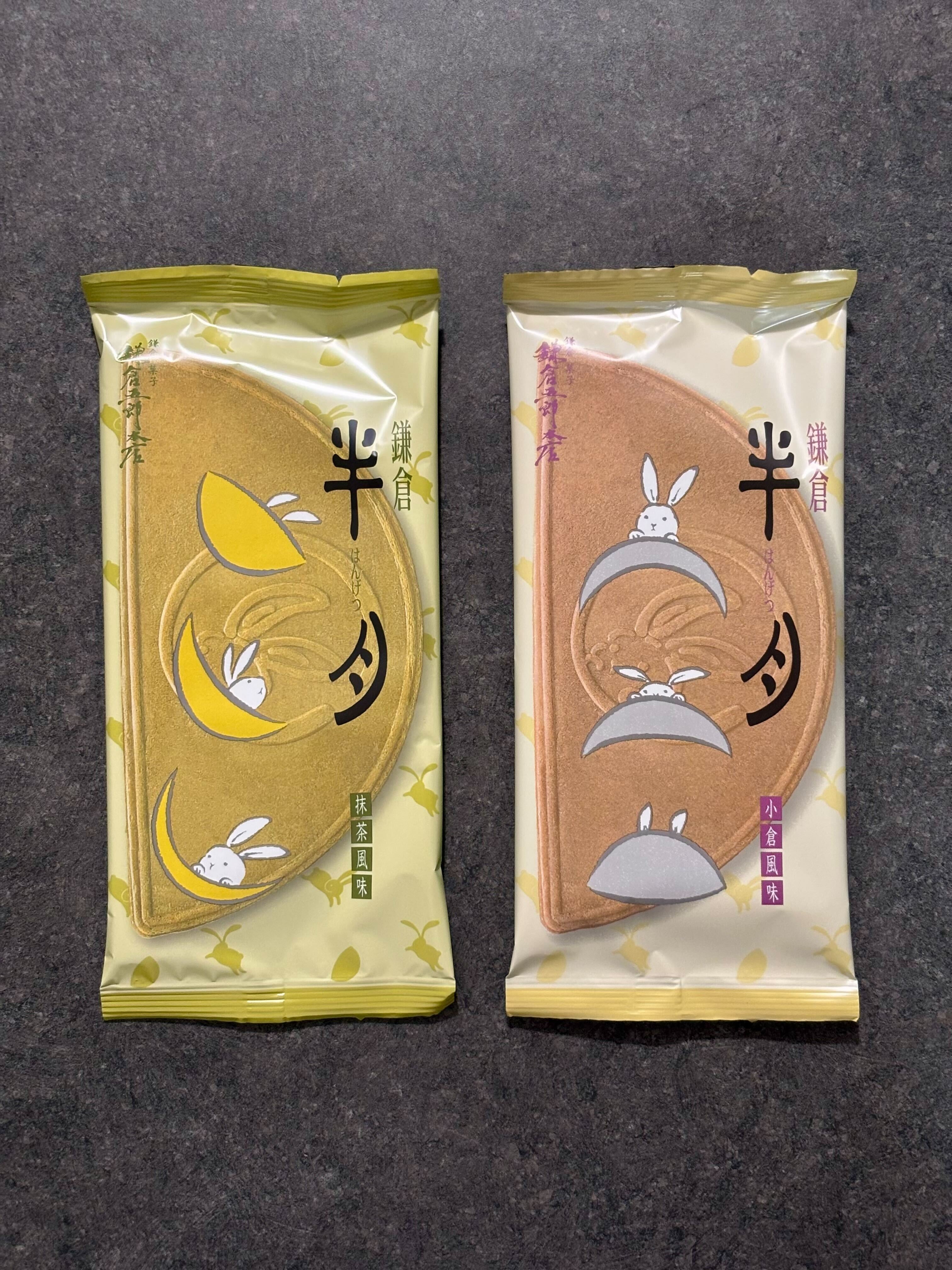Kamakura Hangetsu is a large, crispy, half-moon shaped wafer available with two cream fillings: smooth Ogura (sweet azuki red bean) and fragrant matcha.